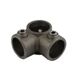 90° corner joint, often used on middle rail on level sites and often paired with type 128. The through tube (vertical in photo) cannot be joined within the fitting.
